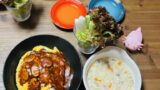 娘のリスエストでナスとモッツァレラチーズが入ったミートソーススパゲッティ、ホタテのカルパッチョ、枝豆、唐揚。