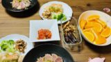 古奈屋のカレーうどん、海老天むす、キャベツとコンビーフの炒め物、枝豆、たくあん。