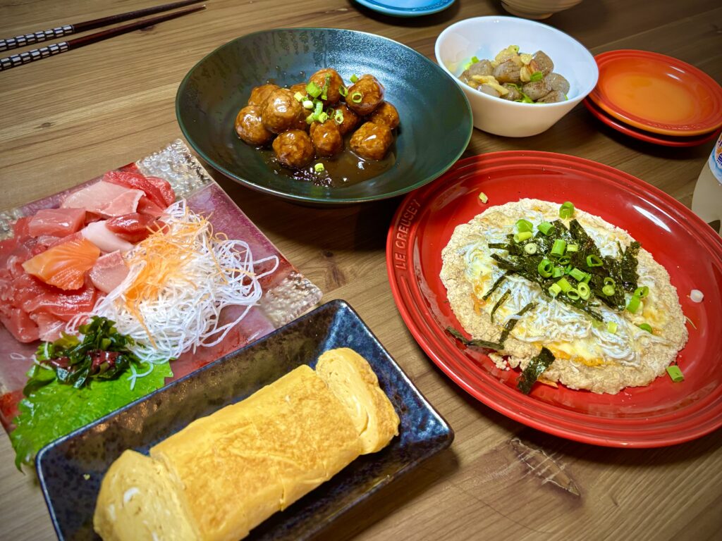 肉団子、刺身、しらすピザ、こんにゃく炒め、だし巻き玉子