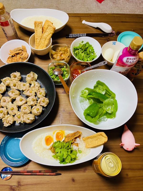 中華風鶏粥、焼売、冷やしピーマン、ザーサイ